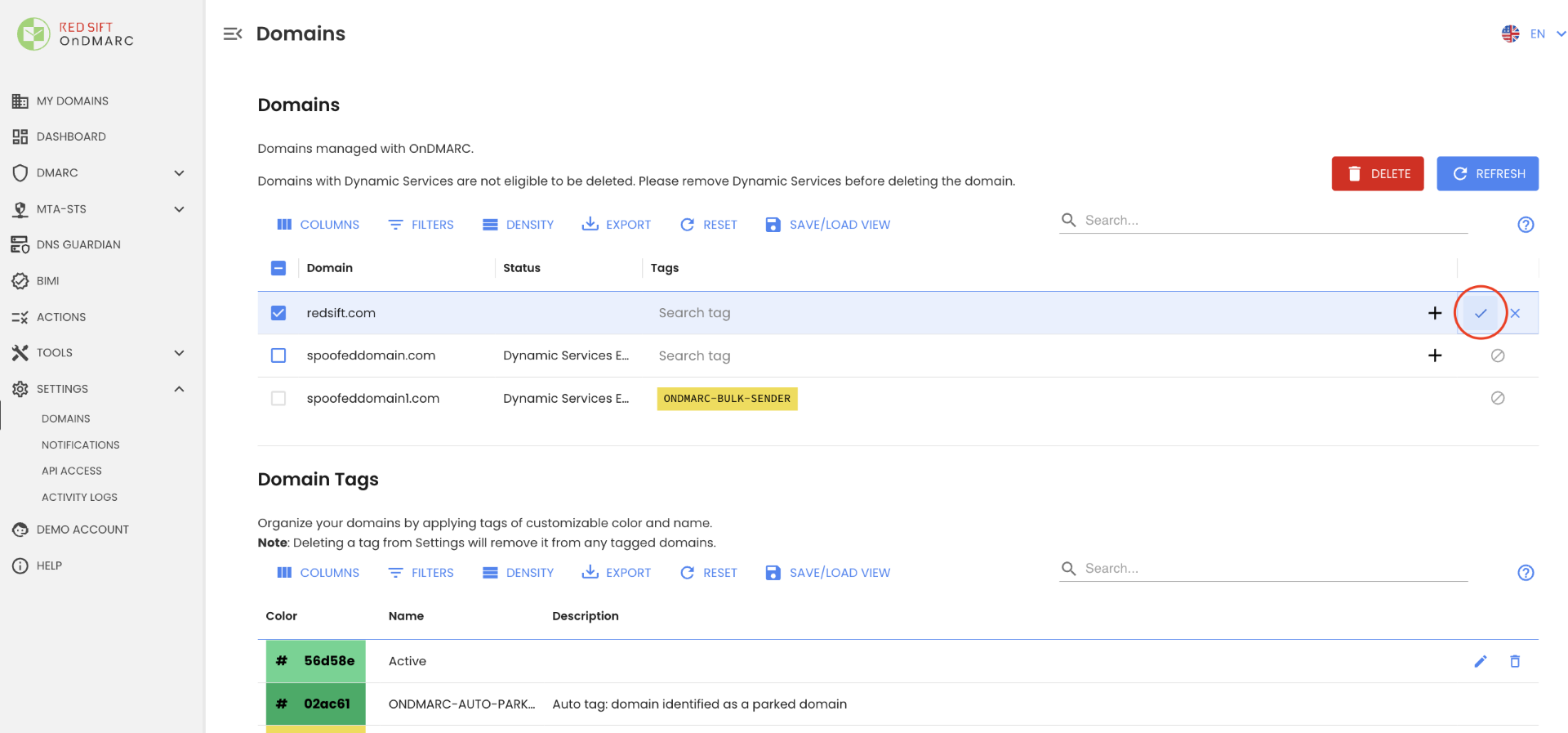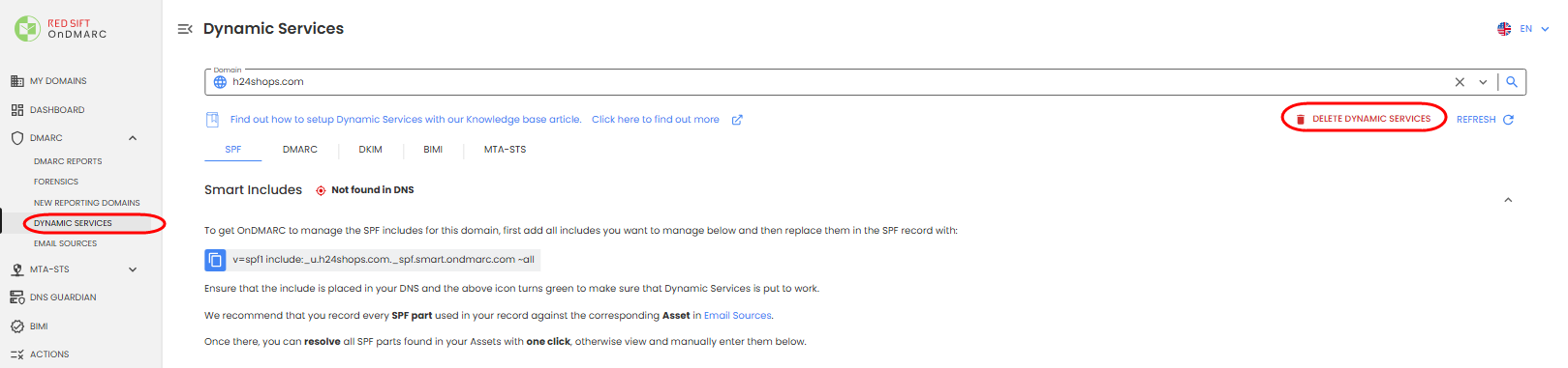 You will first need to delete Dynamic Services of the domains. This can be done by navigating to the DMARC>Dynamic Services. From this page you will click the 'Delete Dynamic Services' button and confirm deletion.